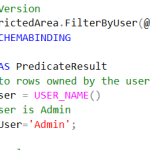 CREATE FUNCTION RestrictedArea.FilterByUser(@User AS sysname) RETURNS TABLE WITH SCHEMABINDING AS RETURN SELECT 1 AS PredicateResult --- Access only to rows owned by the user WHERE @User = USER_NAME() --- Or User if user is Admin OR @User='Admin';